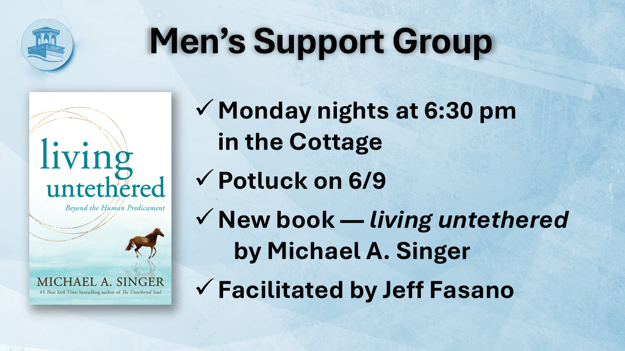 On-going weekly support group which includes “check-in” and focused book study (which changes quarterly). This meeting is open to all men. If you have interest in attending or any questions, feel free to connect with Jeff Fasano at 646 262 0686 or jeff@jefffasano.com.